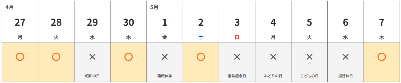 ゴールデンウィークの診療につきましては、以下の通りとなります。